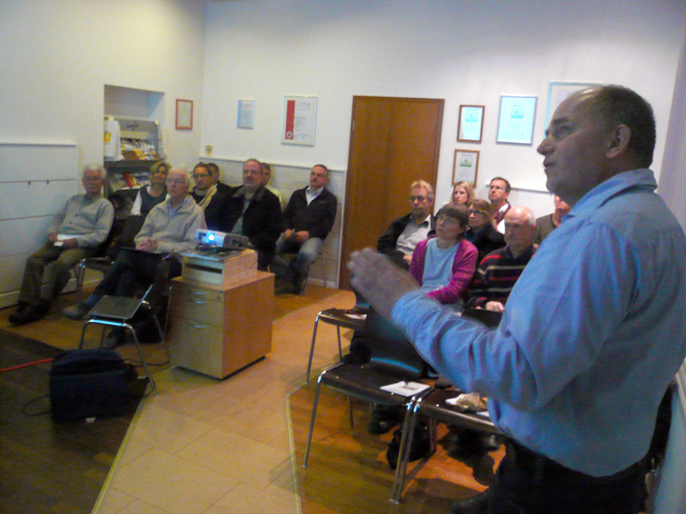 Nach der Pause hielt Herr Maurice Roy von der Firma Roto seinen kurzweiligen Vortrag. Herr Roy hat sich netter Weise bereit erklärt, den angekündigten und kurzfristig erkrankten Referenten Herrn Strähle zu vertreten. Dachfenster sind ein schönes Thema, an dem sich auch unsere weiblichen Besucher gerne beteiligen. Immer rasanter geht auch hier die Entwicklung. Von Handhabung und Dämmwert bis zum programmierbaren Solarrollladen entstehen ständig neue Produkte. Eine Besucherin staunte, wie sich auch die Materialien im Gegensatz zu ihren erst 10 Jahre alten Fenstern verändert haben. So sind z.B. auch die Anschlüsse an das Dach heute von ganz anderer Qualität.