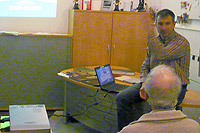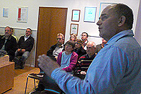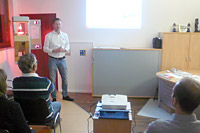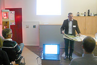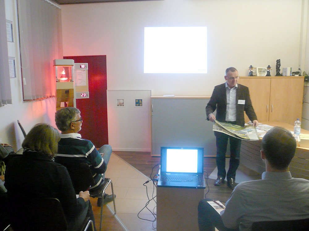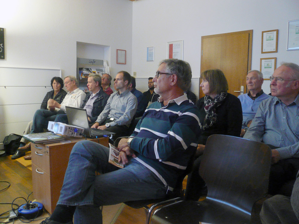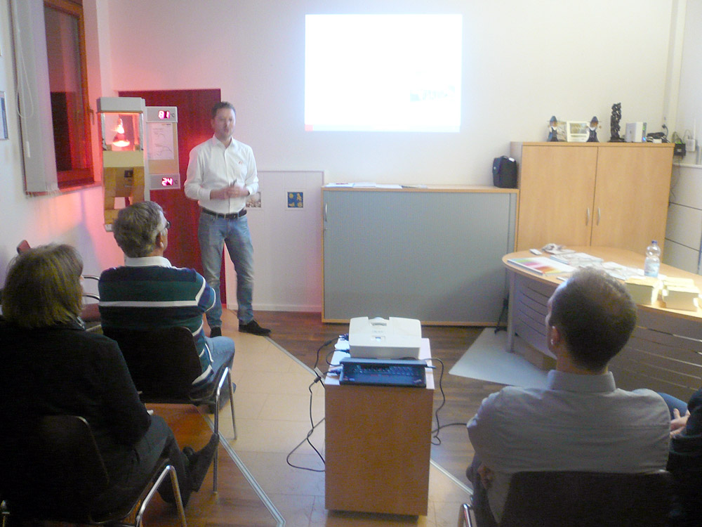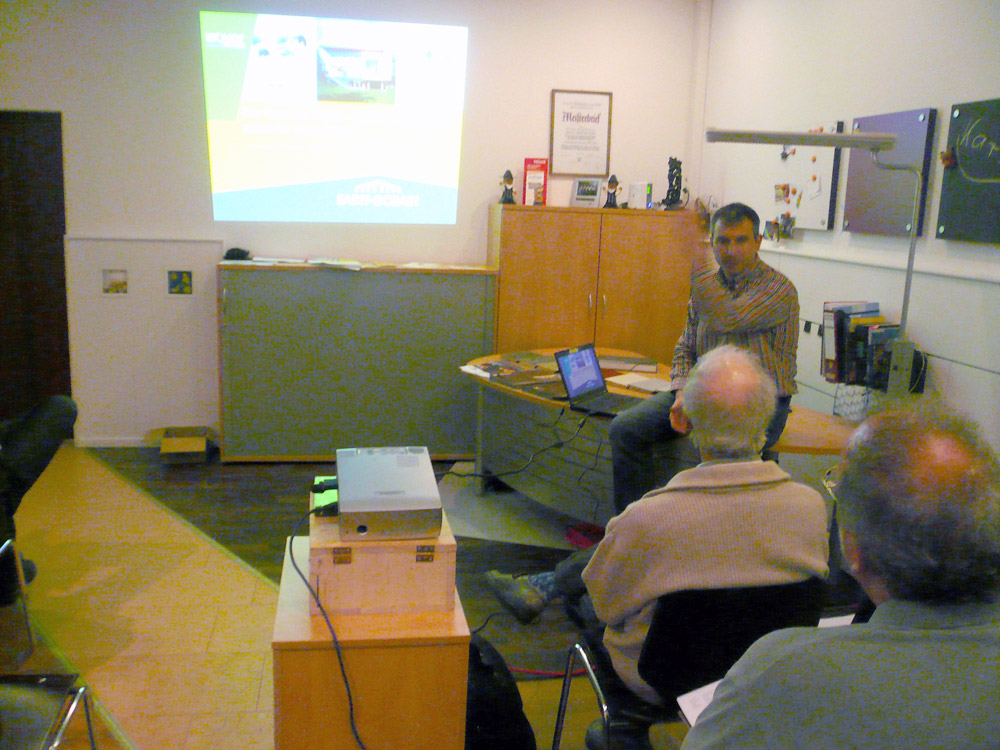 Herr Sibo Wicklein von der Firma Linzmeier GmbH, der bereits zum dritten Mal bei uns referierte, machte den Anfang. Wieder zeigte sich, dass der Umfang des Themas Wärmedämmung kaum in eine halbe Stunde Vortrag zu packen ist. Anhand eines Modells mit Wärmelampe konnte er aber auch dem Laien gut veranschaulichen, wie das Prinzip funktioniert. Er ließ die verschiedenen Dämmmaterialien herumgehen, so dass jeder das Thema "begreifen" konnte. Als es in die technischen Details ging, war es dann Zeit, die Pause mit Zwiebelkuchen und einem Viertele einzuläuten. So konnten sich diejenigen Besucher, die noch Details klären wollten, im kleinen Kreis mit Herrn Wicklein und Herrn Scheyhing austauschen.